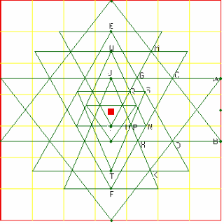 large triangles. Of the nine central triangles, four pointupwards marking 'male' cosmic energy, and five point downwards marking 'female' enrgy. Very precise geometrical knowledge and draughtsmanship