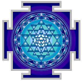 boundary containing four 'doors' leads to the outside world. The central pattern consists of forty-three small triangles, where the gods reside, is produced by the precise intersection of nine