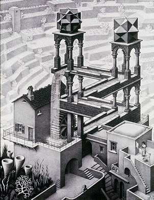 on the brain's insistence upon using visual clues to construct a three-dimensional object from a two-dimensional representation. Escher created many works which address this type of anomaly. One of the most