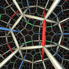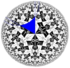 Shown above is a tessellation of triangles in hyperbolic space as represented on the Poincare disc. Each of the triangles is the same shape in hyperbolic