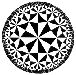 In his woodcut Circle Limit I (1958) shown above, Escher produces a hyperbolic tessellation of birds based on a tessellation of isosceles triangles with