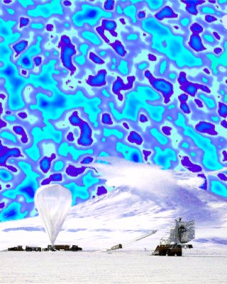 Left: 'The Cosmic Microwave Background sky over Mt. Erebus'. In this fanciful picture, the CMB sky looms behind the pre-launch preparations of BOOMERANG. The BOOMERANG images of the early universe have been overlaid onto the sky to indicate the size that the fluctuations would appear if a standard 35 mm camera were sensitive to microwave light. The color map of the CMB images has been changed here to aesthetically match the rest of the picture.