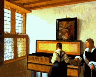 This picture is taken from an animation of a computer generated reconstruction of the geometry of The Music Lesson. The animation was produced by Antonio Criminisi and his team at the Robotics Department of Oxford University.