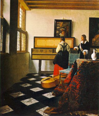 Steadman’s model of the room confirms the extraordinarily high levels of internal optical consistency in paintings like The Music Lesson - even down to the penumbral fan of shadows beside the mirror on the end wall. It seems likely that the artist laid down the basic disposition of the forms on the basis of their projection through a lens inserted into an aperture in a partition and on to  a screen attached to the opposite end wall.  In such an image, the tones and colours would typically be condensed into a beguilingly unified ‘picture’ on a appropriate scale. The presence of pin-hole pricks at the vanishing points in some of his canvases does not refute the use of the camera, but shows the care with which Vermeer drafted the resulting geometry on the pictorial surface.