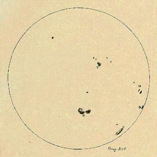 In 1611, Galileo wrote: "Spots are on the surface of the solar body where they are produced and also dissolved, some in shorter and others in longer periods. They are carried around the Sun; an important occurrence in itself." One of Galileo's drawings is shown above. Click the picture to view an animation constructed from a sequence of Galileo's sunspot drawings. Galileo’s ideas got him into trouble with church leaders, because all heavenly bodies were supposed to be perfect, that is ‘without blemish’.