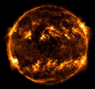 Sunspots are still a bit of a mystery, even almost 400 years later! We can now observe the Sun at different wavelengths in the electromagnetic spectrum, besides the visible range. Above right is an image of the Sun in ultraviolet emission obtained with an instrument on the Solar and Heliospheric Observatory (SOHO), a joint NASA and ESA satellite. Click the picture to view a video clip from SOHO.
